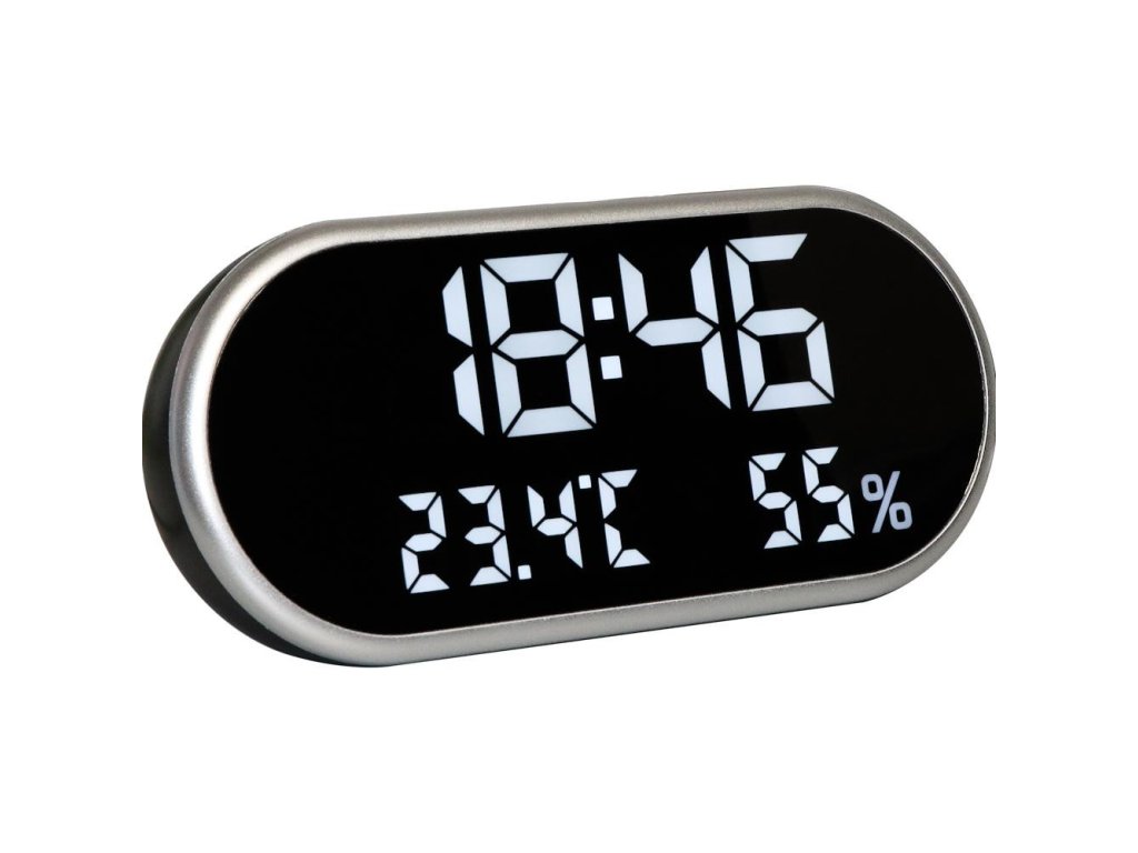 Digitální LED budík s ukazatelem teploty a vlhkosti. Displej má vzhled zrcadla.
