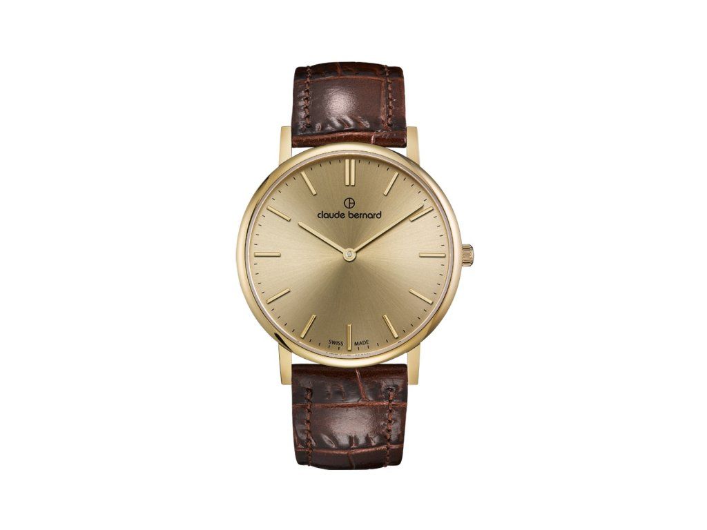 Švýcarské hodinky Claude Bernard Two Hands, pouzdro je vyrobeno z chirurgické oceli 316L s povrchovou PVD úpravou ve zlaté barvě, srdcem hodinek je švýcarský strojek RONDA 762, hodinky mají safírové sklo, WR 3ATM - jsou tedy odolné proti pocákání a lehkému dešti, mají jednoduchý a přehledný číselník, ručky, idnexy a číselník jsou ve zlaté barvě, kožený řemínek v hnědé barvě se vzorem aligátoraBuďte první, kdo napíše příspěvek k této položce.