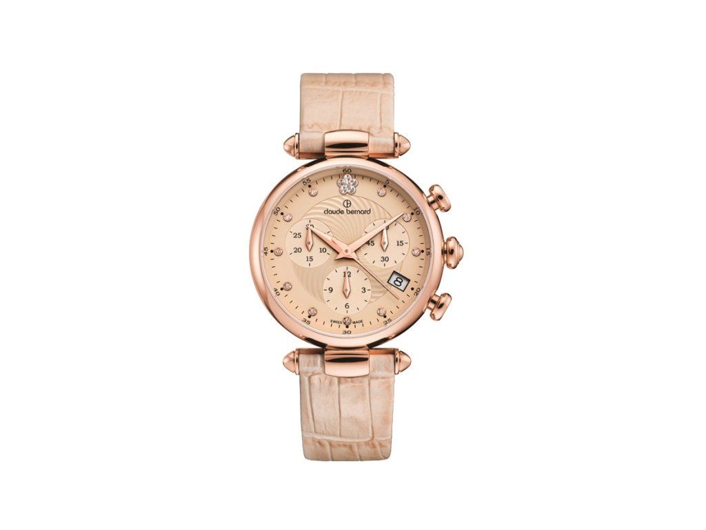 Dámské quartzové hodinky z chirurgické oceli s PVD potahem v barvě růžového zlata, průměr pouzdra je 35mm, datum, chronograf, béžový číselník, místo indexů jsou Swarovski krystaly, na pozici 12 hodiny je místo indexu květ, safírové sklo, kožený béžový řemínekBuďte první, kdo napíše příspěvek k této položce.