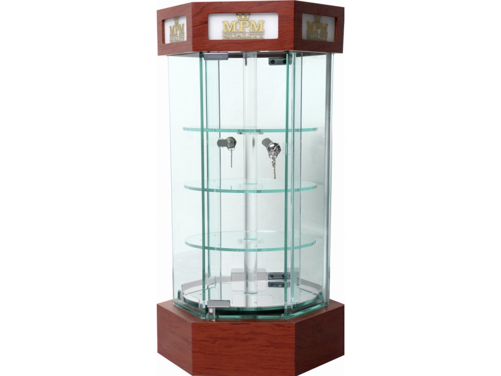 Výstavní displej na hodinky s logem MPM-quality (možnost změny loga dle domluvy) s ručním otáčením a s možností uzamknutí na klíč. Displej je vybaven osvětlením a síťovým napájecím kabelem. Vnější materiál MDF s laminem, sklo akrylátové.