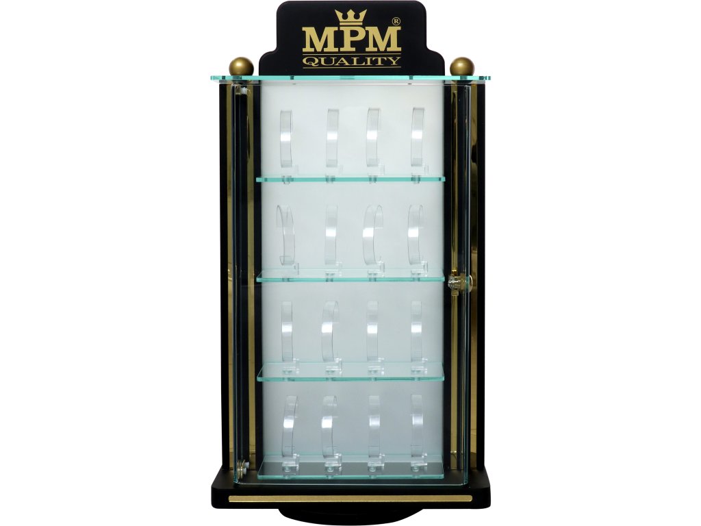 Výstavní displej na hodinky s logem MPM-quality (možnost změny loga dle domluvy) s ručním otáčením a s možností uzamknutí na klíč. Vnější materiál MDF s laminem, sklo akrylátové.