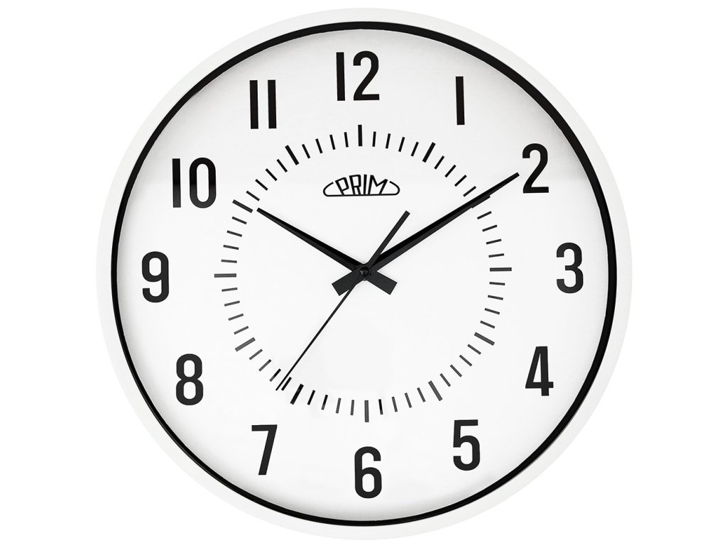 Hodiny PRIM Elementary s arabskými číslicemi v klasickém čistém designu s plynulým chodem.
