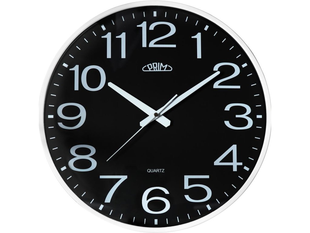 Hodiny PRIM s arabskými číslicemi v klasickém čistém designu v plastovém provedení s plynulým chodem.