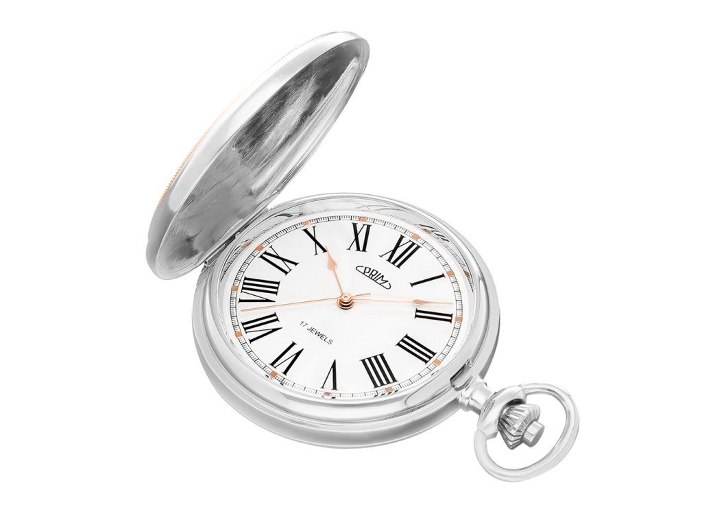 Klasické mechanické kapesní hodinky PRIM s ručním nátahem s římskymi číslicemi. Nově navržený plášť hodinek zdobí symbol českého znaku, tedy dvouocasý lev doplněný erbem, který se perfektně hodí k individualizaci monogramu. Hodinky jsou dodávány s nerezovým řetízkem.