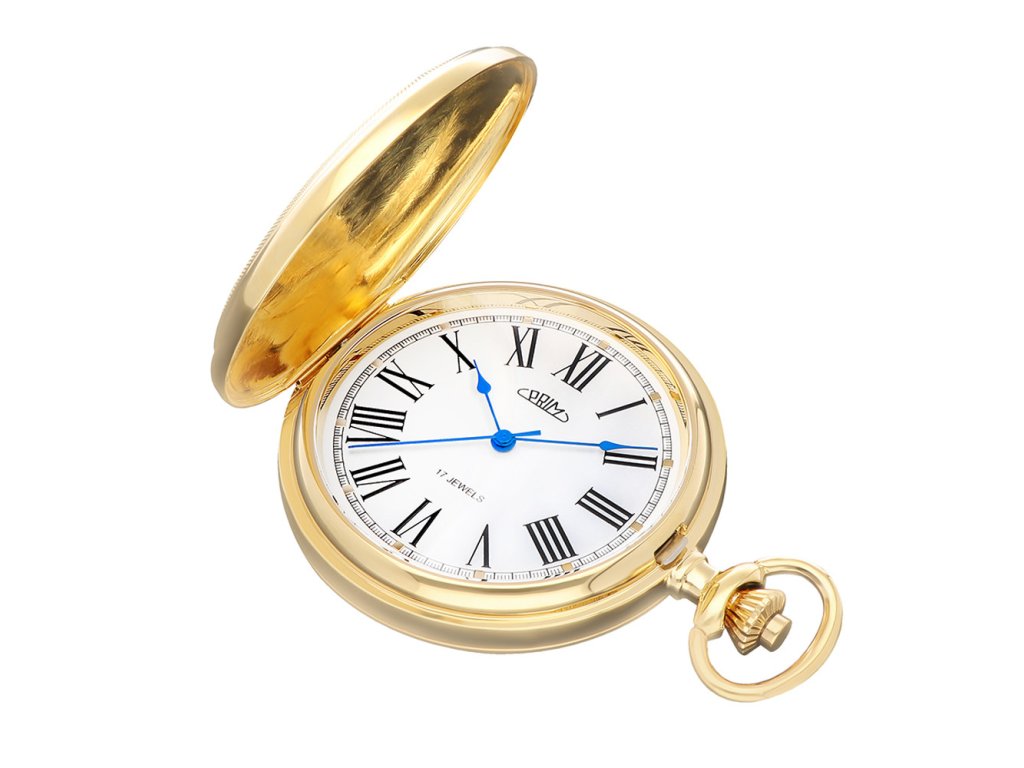 Klasické mechanické kapesní hodinky PRIM s ručním nátahem s římskymi číslicemi. Nově navržený plášť hodinek zdobí symbol českého znaku, tedy dvouocasý lev doplněný erbem, který se perfektně hodí k individualizaci monogramu. Hodinky jsou dodávány s nerezovým řetízkem.