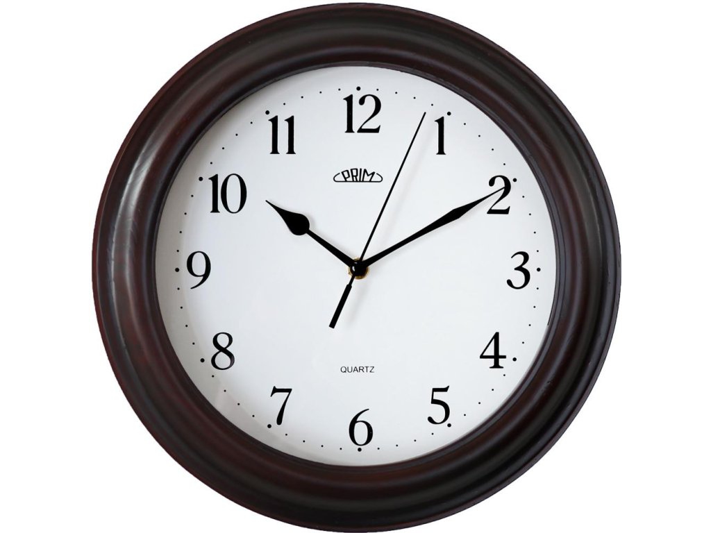 Klasické dřevěné hodiny PRIM v čistém designu s arabskými číslicemi.