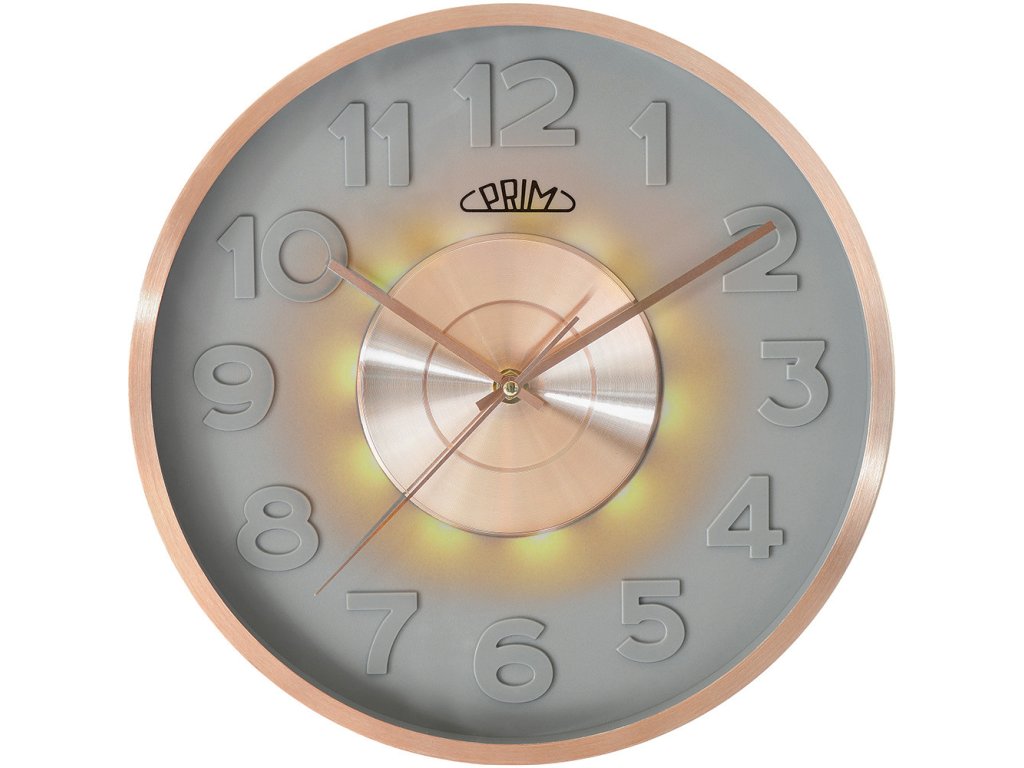 Designové nástěnné hodiny PRIM Sensation o průměru 296 mm se světelným a zvukovým senzorem v elegantním růžovém zlacení. Růžovému zlacení se nevyhnuly ani další komponenty, které perfektně doplňuje matně stříbrný číselník s plastickými arabskými číslicemi.