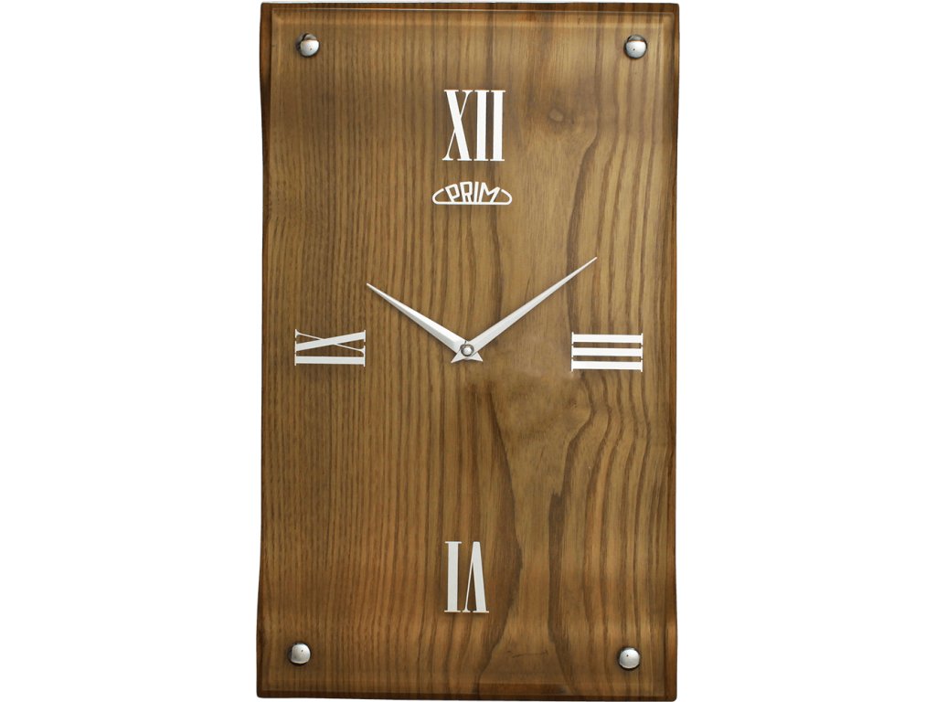 Dřevěné nástěnné hodiny PRIM v kombinaci skla a dřeva.