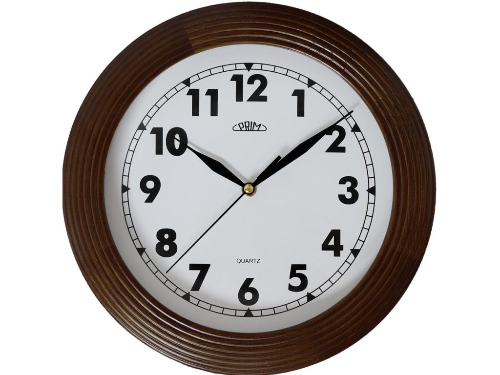 Klasické dřevěné hodiny PRIM s arabskými číslicemi.
