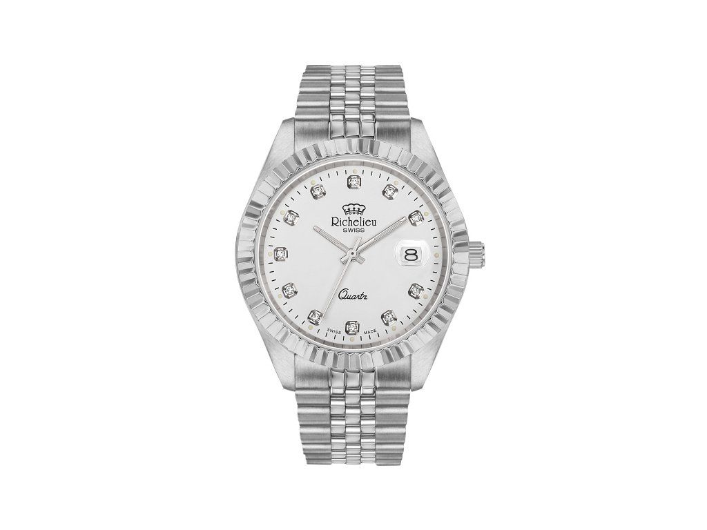 Švýcarské pánské quartzové hodinky Richelieu, pouzdro i náramek jsou z oceli, průměr pouzdra je 42mm, v hodinkách je švýcarský strojek RONDA 515, voděodolnost je 5 ATM - jsou tedy odolné proti lehkému osprchování ale jsou nevhodné pro plavání, hodinky mají minerální sko, bílý číselník, datum je na pozici indexu 3, idnexy jsou vykládány štrasem (štras je broušené kompoziční sklo s vysokou hodnotou lomu světla), nad těmito indexy jsou umístěny luminescenční tečky pro lepší čitelnost v šeru i ve tmě, hodinová a minutová ručka je také luminescenčníBuďte první, kdo napíše příspěvek k této položce.